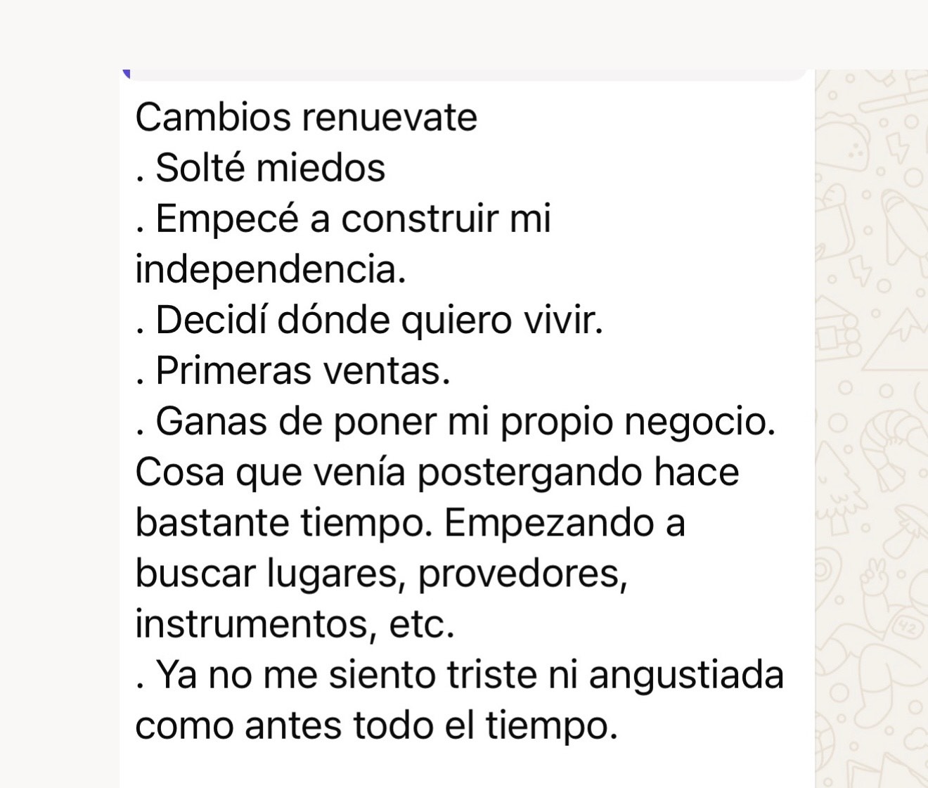 Tus pensamientos y acciones tienen el PODER de CREAR el CAMBIO que DESEAS. Recuerda que cada pequeño paso que das hacia adelante es un logro en sí mismo. No importa lo que hayas vivido, siempre hay una oportunidad para empezar de nuevo y crear un futuro mejor.